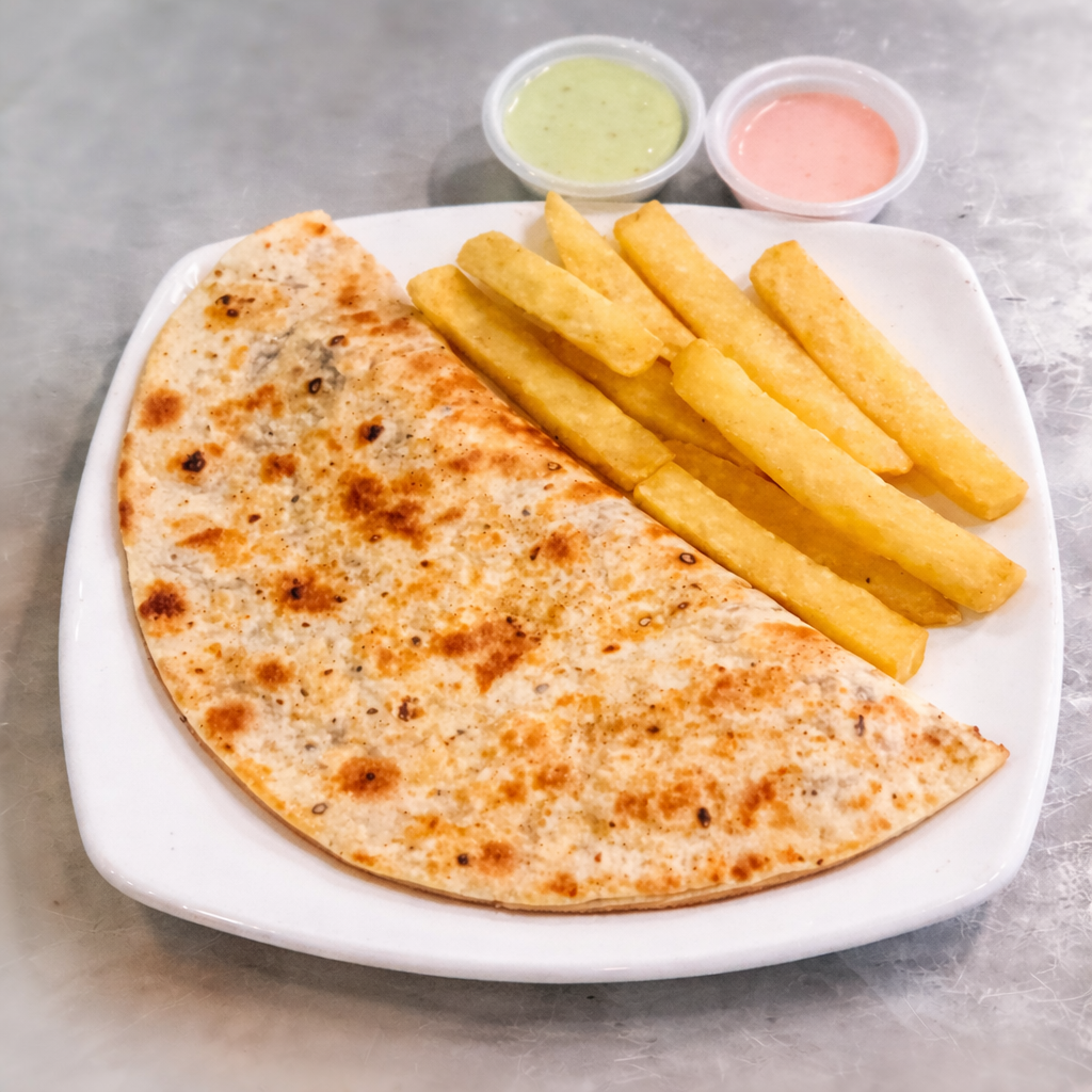 Delicioso taco preparado con pollo desmechado, lechuga fresca y queso, envuelto en una suave tortilla de trigo. Acompañado de papas fritas y una selección de salsas para realzar su sabor, ideal para disfrutar una comida completa y llena de sabor.